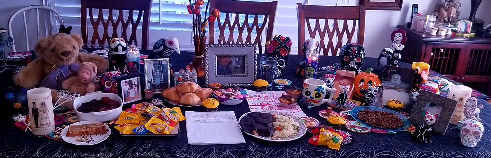 This shows our family altar with their favorite foods and photos to commemorate and celebrate